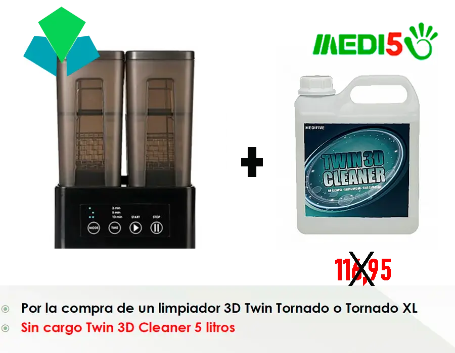Con tu compra, recibes Twin 3D Cleaner 5 litros SIN CARGO, un producto especialmente formulado para eliminar residuos de resina de forma eficaz, cuidando tanto las piezas como el equipo.